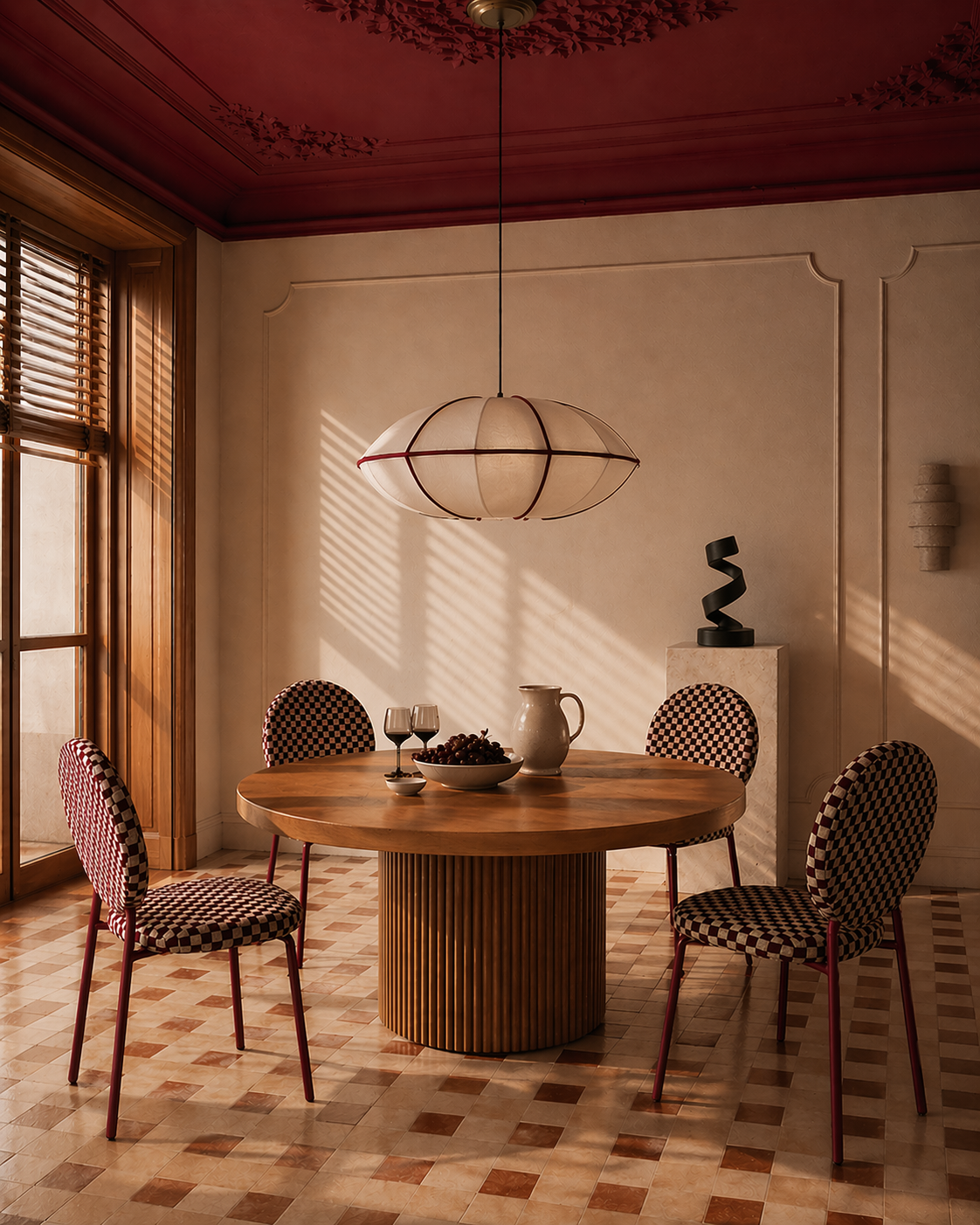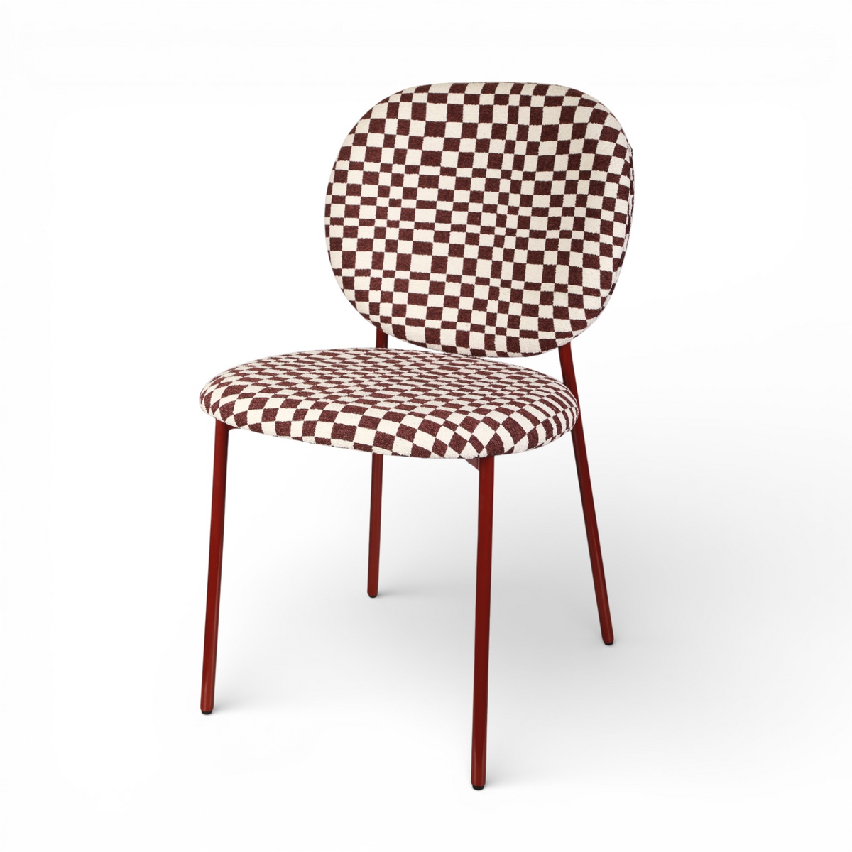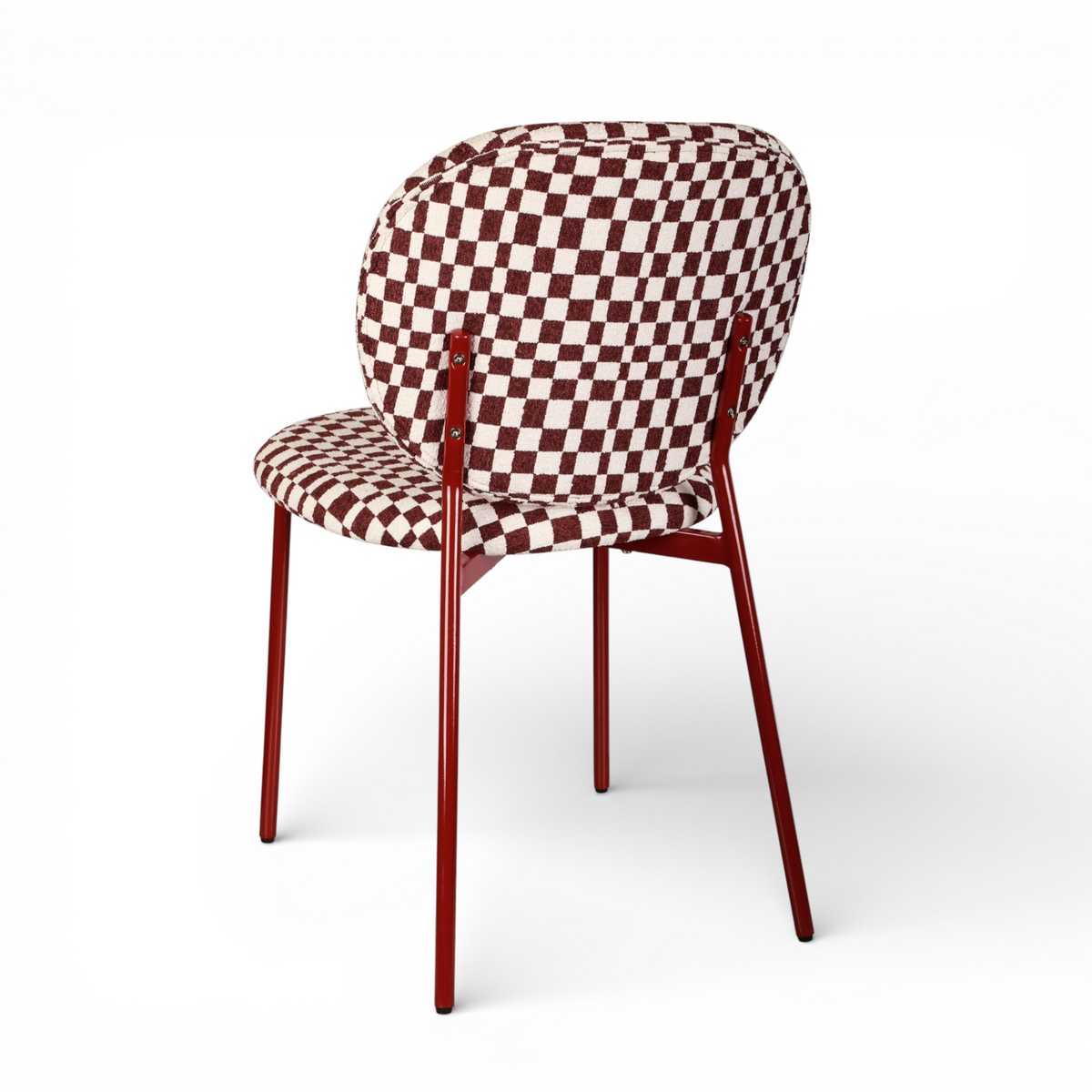 Krzesło Damier to harmonijne połączenie komfortu i designu — tapicerowane miękką tkaniną o modnym bordowym odcieniu z kontrastową kratą, która wprowadza do wnętrza nutę klasycznej elegancji z nowoczesnym twistem. Ergonomiczne siedzisko oraz estetyczny profil sprawiają, że każdy posiłek, spotkanie czy chwila relaksu przy kawie staje się przyjemnością.